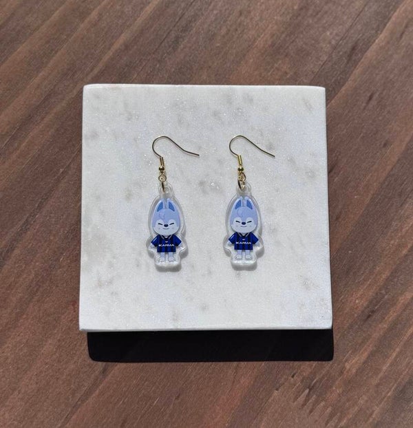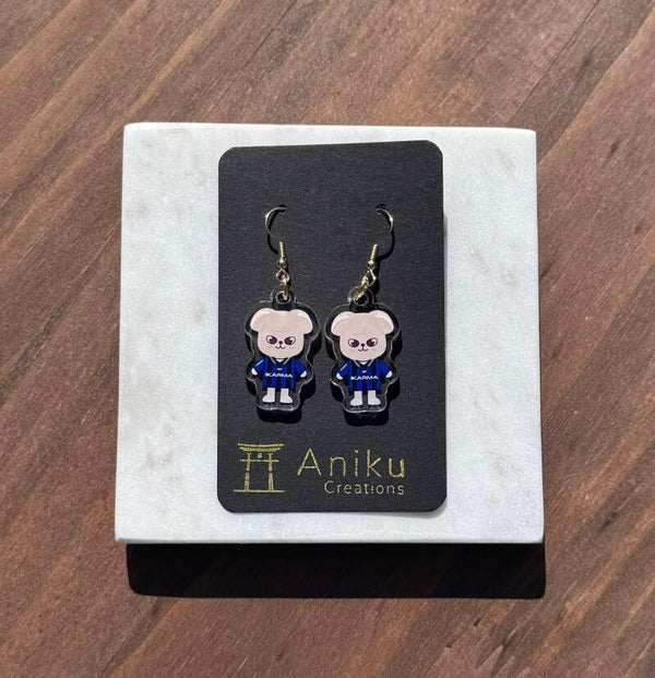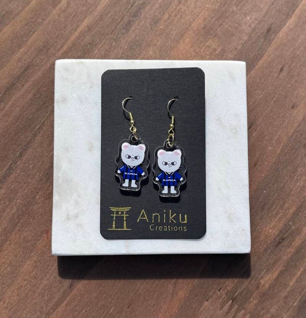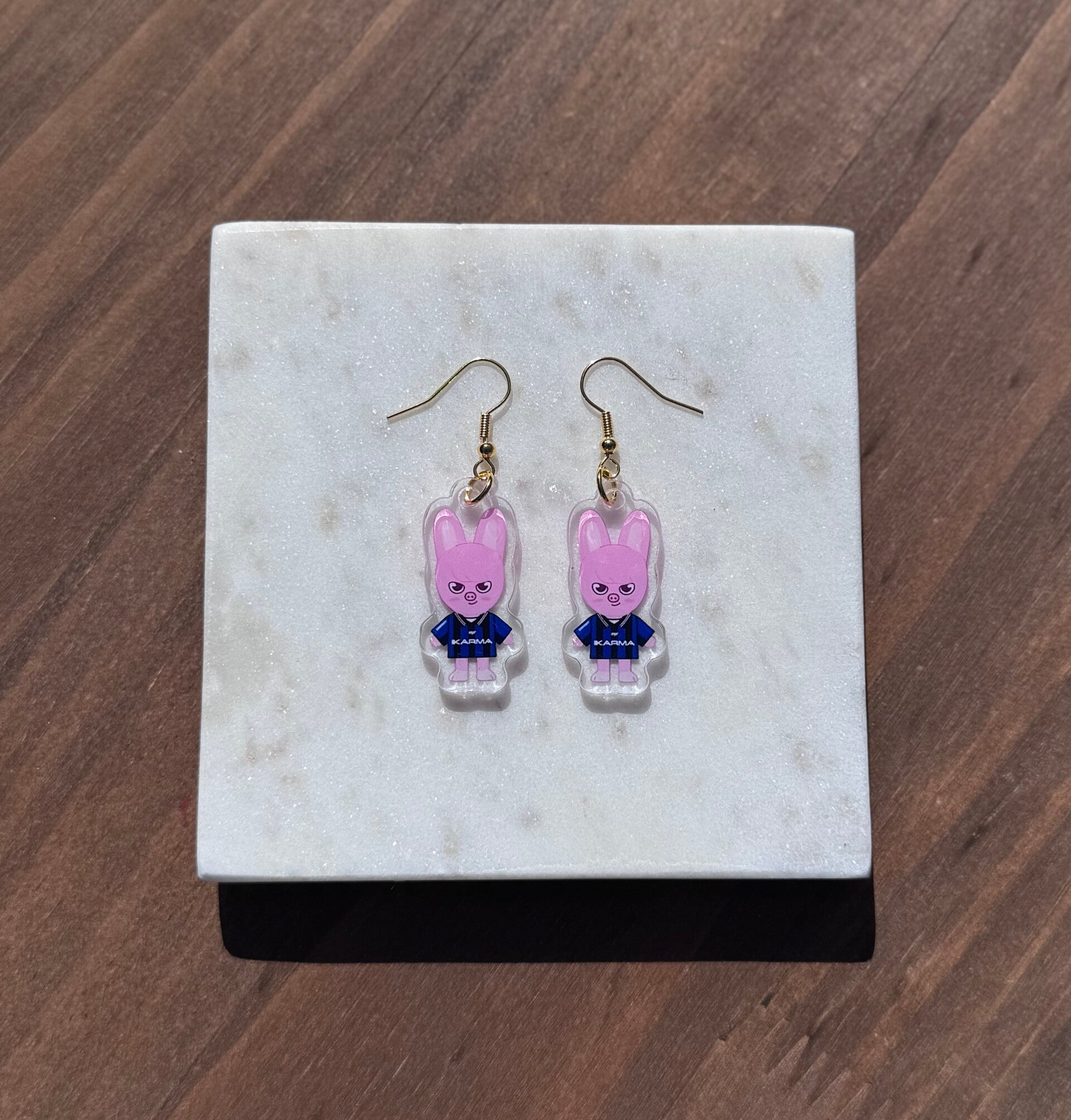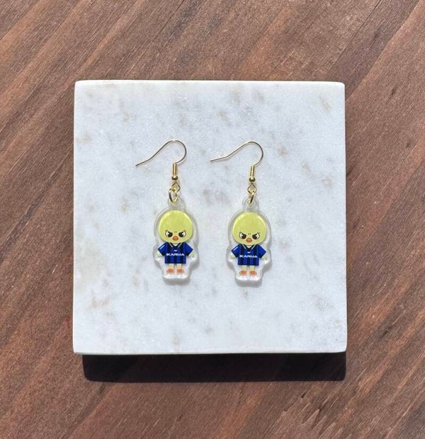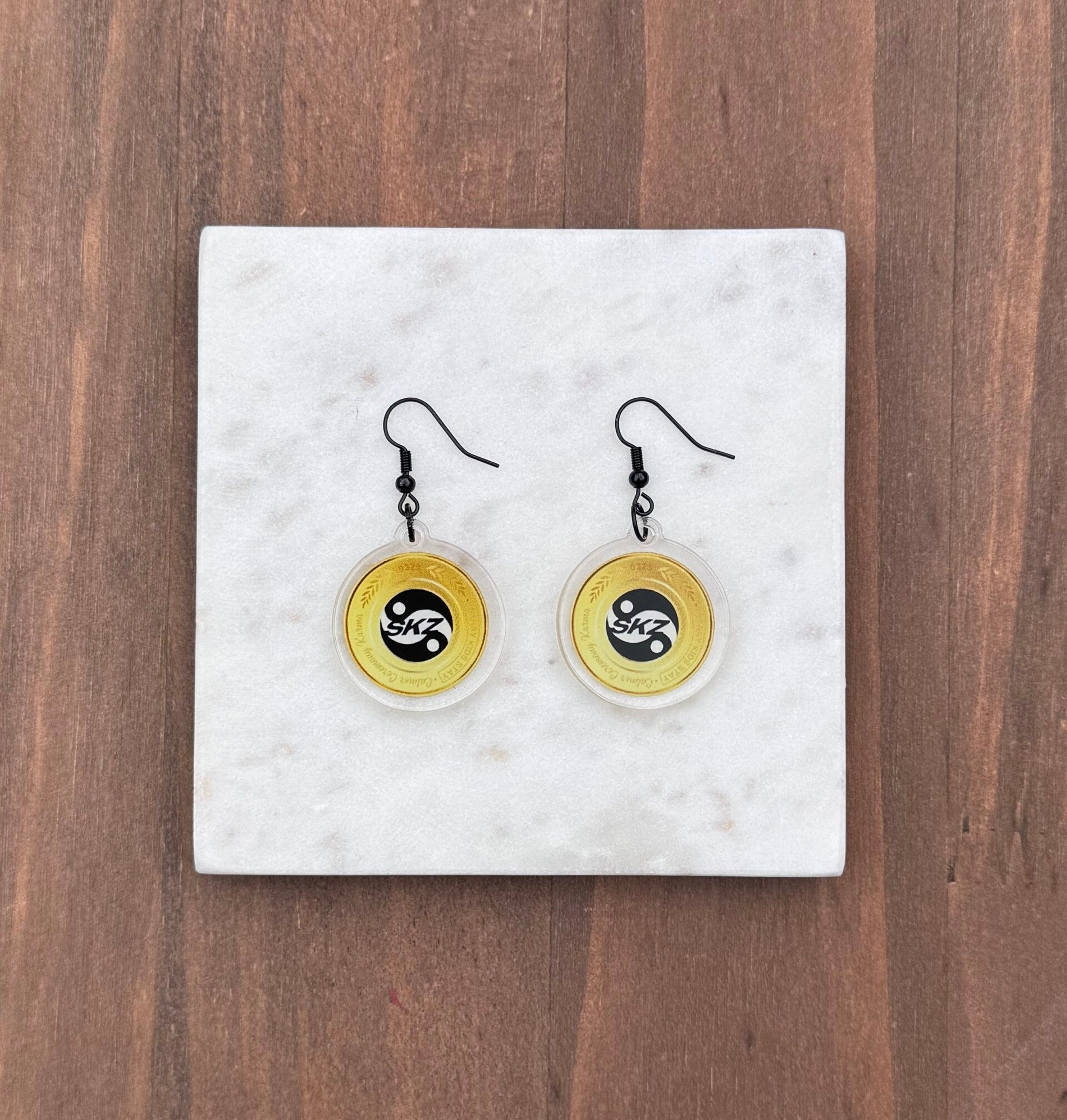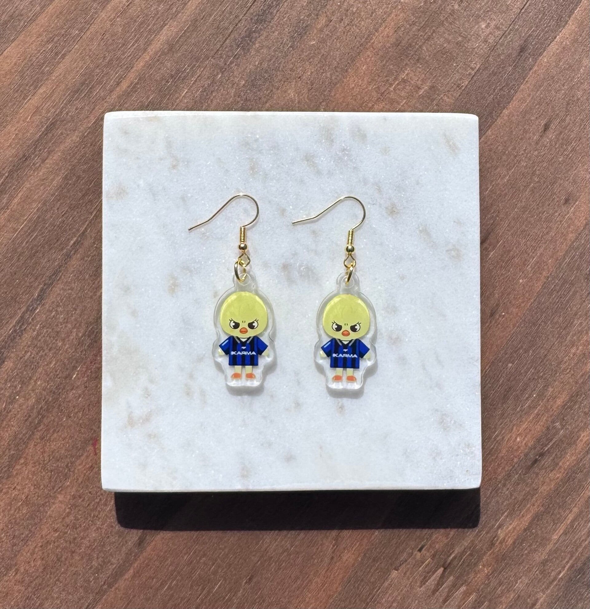* Earrings, with SKZOO wearing the KARMA tshirt. The earpins are made of goldcoloured steel. Pendant is ca. 2,5 cm.
